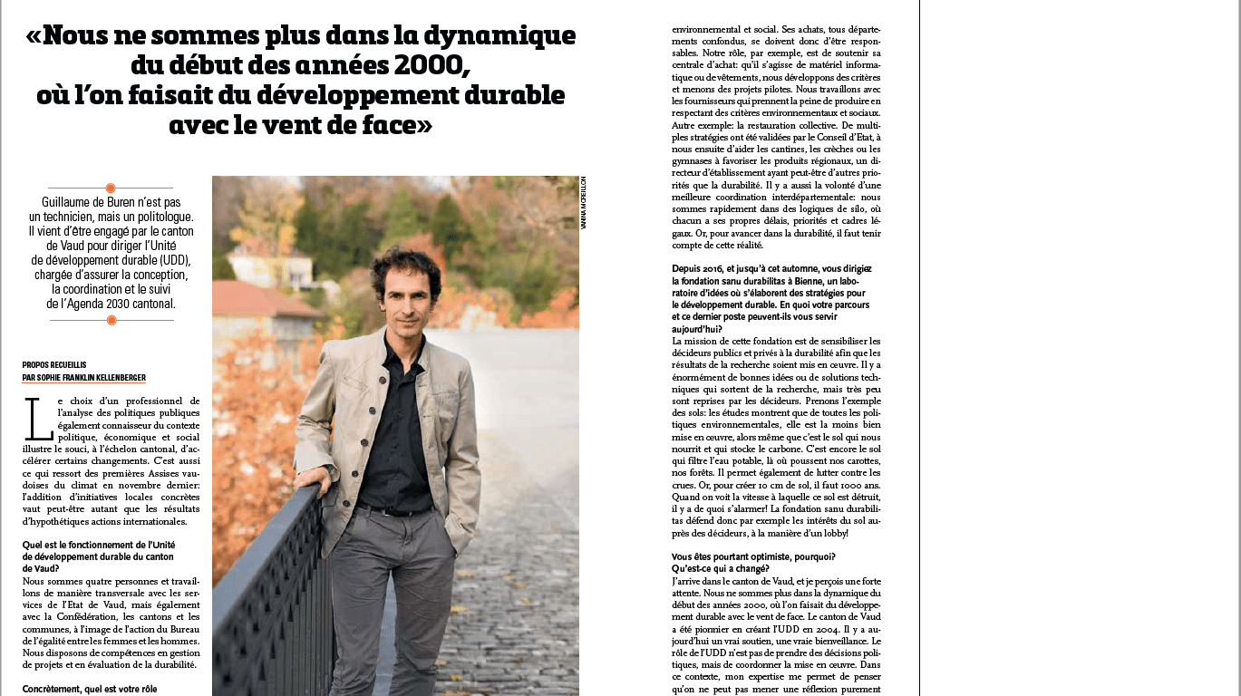 Guillaume de Buren n’est pas un technicien, mais un politologue. Il vient d’être engagé par le canton de Vaud pour diriger l’Unité de développement durable chargée d’assurer la conception, la coordination et le suivi de l’Agenda 2030 cantonal.