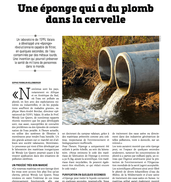 Un laboratoire de l’EPFL Valais a développé une « éponge » révolutionnaire capable de filtrer, en quelques secondes, de l’eau contaminée par des métaux lourds. Une invention qui pourrait préserver la santé de millions de personnes dans le monde.