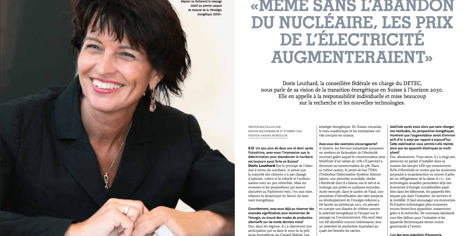 Doris Leuthard, conseillère fédérale en charge du DETEC, nous parle de sa vision de la transition énergétique en Suisse à l’horizom 2050. Elle en appelle à la responsabilité individuelle et mise beaucoup sur la recherche et les nouvelles technologies. Interview réalisée en 2013, deux ans et demi après la catastrophe de Fukushima.