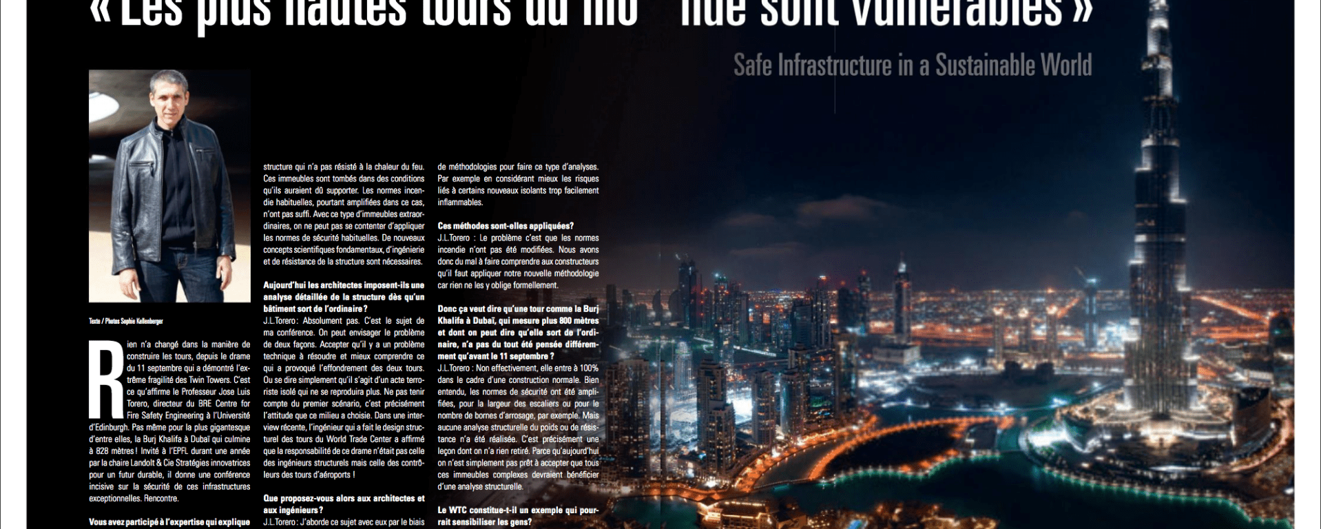Rien n’a changé dans la manière de construire les tours depuis le drame du 11 septembre qui a démontré l’extrême fragilité des Twin Towers. C’est ce qu’affirme le Professeur Jose Luis Torero, directeur du BRE Centre for Fire Safety Engineering à l’Université d’Edinburgh.